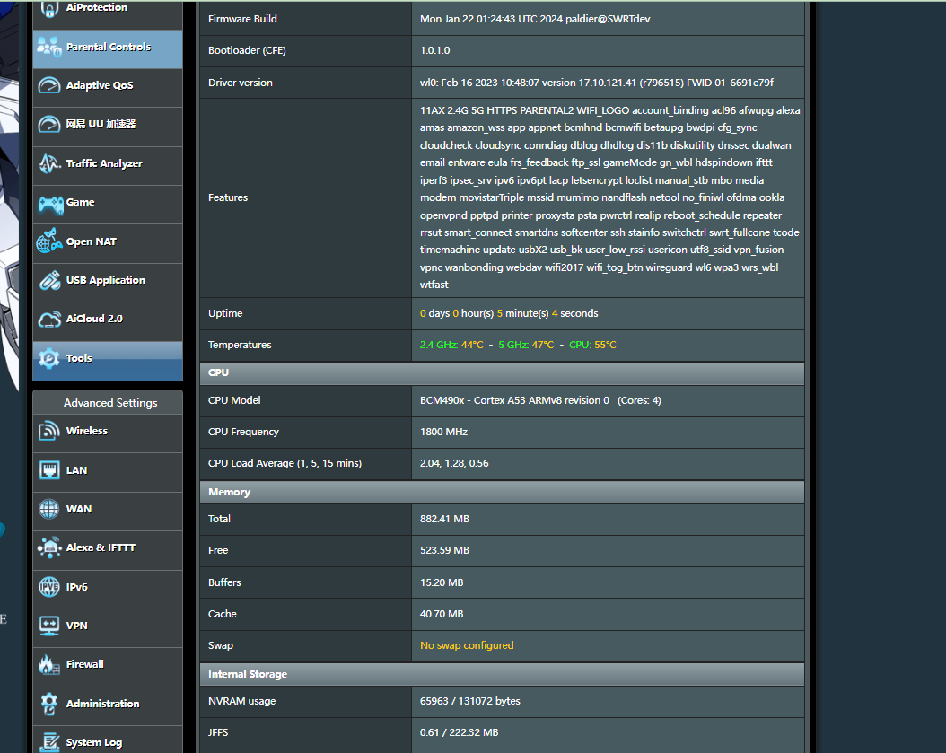 获取固件:到帖子最下方下载RAX80_NTGR2ASUS.chk以及最新版固件,本文以3.0.0.4_RAX80_R5.2.5_20187-g4f197a2_squbi.w为例.使用校验软件,如Hash(下载地址)对下载的固件进行校验,确保固件md5校验值和固件发布贴公布的md5相同。上传固件:使用电脑chrome浏览器登录网件固件后台,依次进入【高级】 - 【管理】 - 【路由器升级】页面,在此页面上传RAX80_NTGR2ASUS.chk固件,固件上传后,会提示更新,点击是开始正式刷机,等待刷机完成自动重启,等待刷机完成自动重启。登录swrt官改:路由器重启完成后,刷机web界面将会自动跳转到SWRT官改固件的设置向导。如果没有进入到设置向导,请手动在浏览器中访问:http://192.168.50.1 或者 http://router.asus.com ,跳转到设置向导页面,根据向导对路由器的上网方式、无线网络、帐号密码等进行设置。设置完成后需要更新正式固件,【系统管理 】- 【 固件升级】页面下直接上传.w后缀的固件,本文以3.0.0.4_RAX80_R5.2.5_20187-g4f197a2_squbi.w为例。(如果无法访问,请配置网卡为静态IP:192.168.50.10,掩码:255.255.255.0,网关192.168.50.1,再尝试进行访问)恢复出厂:第一次刷机,还需要在SWRT官改固件下进行一次恢复出厂的操作。在【系统管理】 - 【恢复/导出/上传设置】- 【原厂默认值】处,勾选【恢复】按钮右上角选框,点击【恢复】后并确认操作,此时路由器将重启,并 将固件恢复到出厂设置。